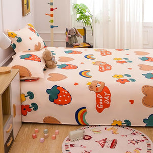 This flat bedsheet comes with two matching pillow covers, making it a complete set that brightens any child's bedroom with playful strawberry-themed patterns. Ideal for parents seeking quality and style in children's bedding.